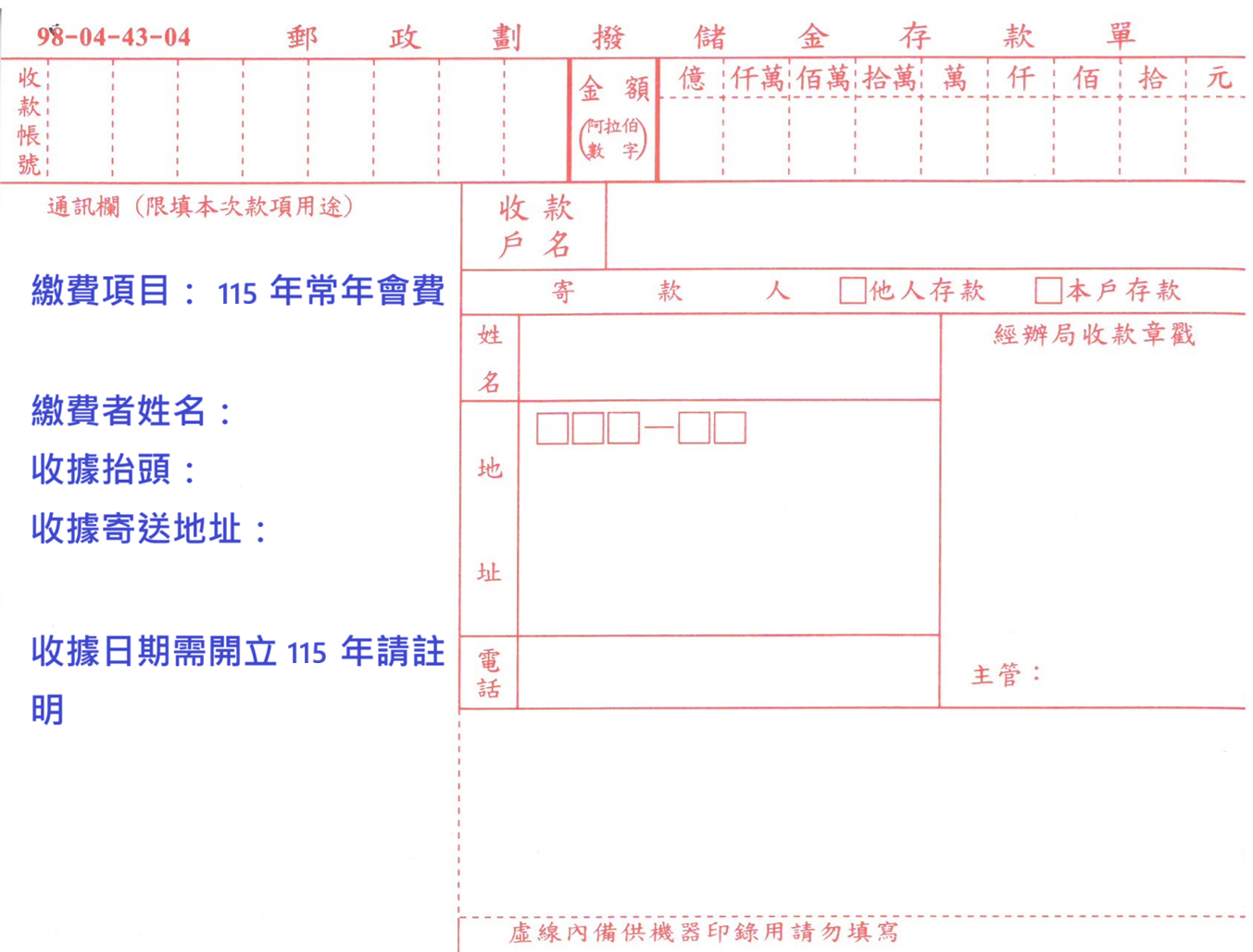 新台幣 2400元 (114年及115年常年會費) 114年常年會費請於10月17日前繳交 |